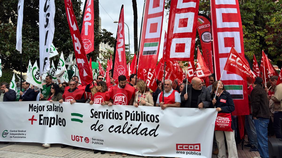 CCOO, UGT y CSIF han iniciado un calendario de movilizaciones en toda España en protesta por el bloqueo a la negociación colectiva del Ministerio de Función Pública, que mantiene congeladas las nóminas de este año e impide un nuevo acuerdo salarial, entre otras mejoras de condiciones laborales. Bajo el lema “Negociación, subida salarial y mejora de los servicios públicos”, en Extremadura, la concentración de protesta ha tenido lugar en Badajoz.